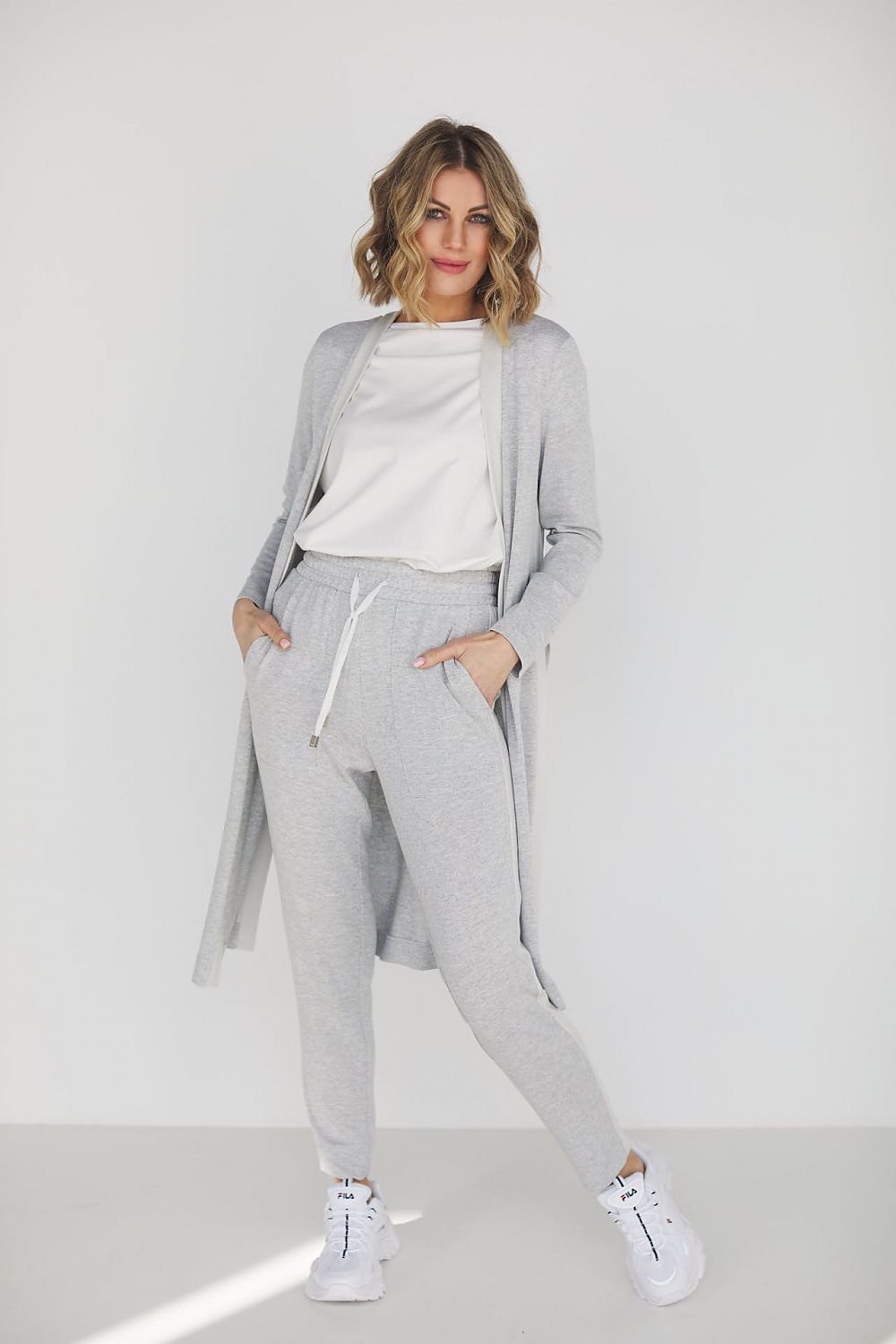 Do you value comfort and convenience? Meet our sporty and elegant set. Why is it so special? Because it was constructed with a wide range of sizes and great versatility in mind. We sewed it from a soft and stretchy viscose knit that has a thin sweater weave. So you can dress it up for everyday shopping as well as for occasional gatherings with friends. Careful sewing and metal hardware will make you feel special. The pants are characterized by a high waist. They have a wide elastic waistband, additionally adjustable with a drawstring. The blouse, on the other hand, has a loose classic cut. All this is to make women of different sizes feel comfortable in the brand's clothing.