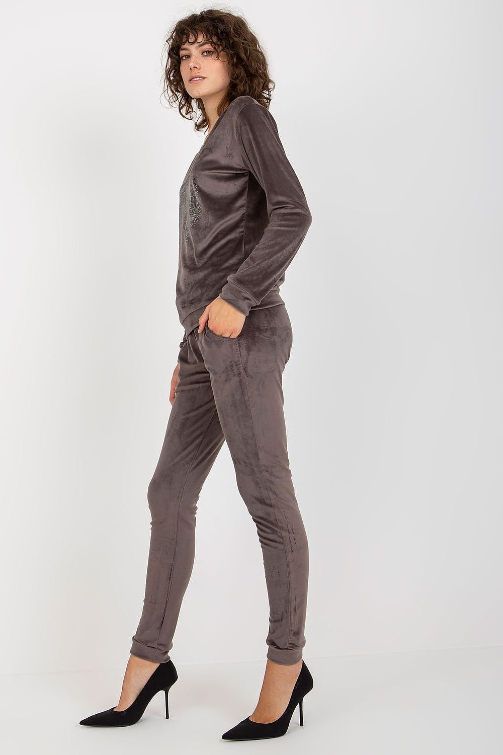 Velour set consisting of a blouse and pants. Blouse with long sleeves and a heart neckline. Long pants with a tie at the waist and slip pockets.