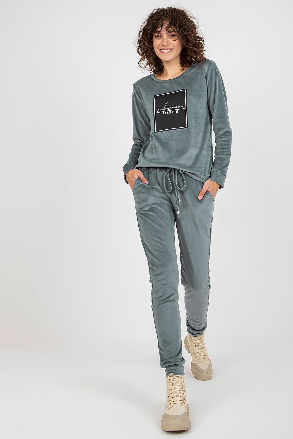 Velour tracksuit set consisting of a sweatshirt and pants. Sweatshirt tucked in over the head with long sleeves, decorative inscription on the front. Long pants with a tie at the waist and slip pockets.