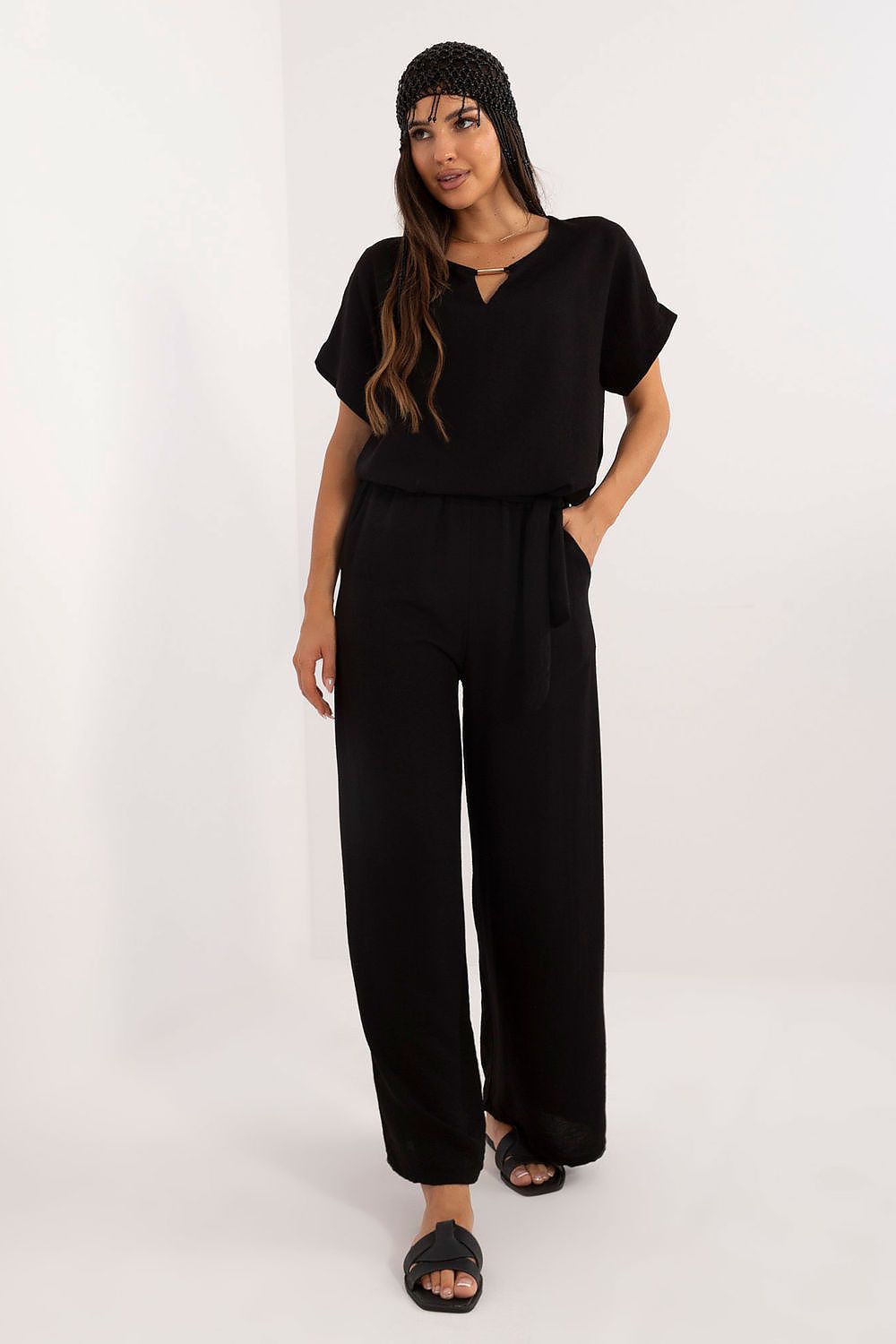 This casual set consisting of a blouse and pants is an ideal choice for everyday styling and for work. Made of dominant viscose, it provides comfort and breathability throughout the day. Smooth material in a solid color gives the set an elegant, yet casual character. The blouse with short sleeves and a round neckline is perfectly matched with long pants with wide legs. The high-waisted pants emphasize the waist, while the tie belt adds a stylish touch. Practical side slip pockets increase functionality. It's a versatile ensemble that's perfect for the office and everyday wear.